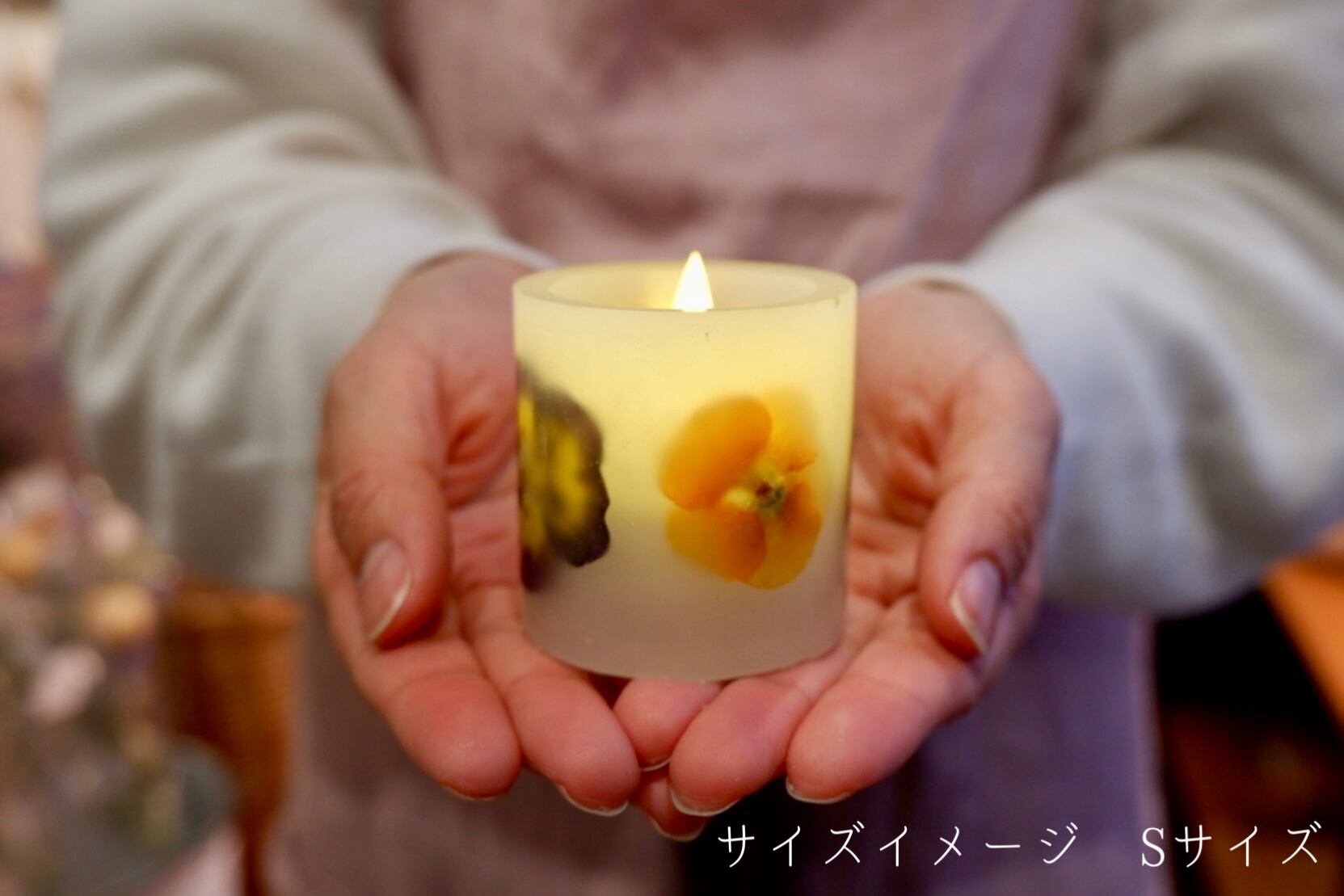 発色や質の良い自家製ドライフラワーを国産無添加ワックスに閉じ込めたボタニカルキャンドルランタンです。