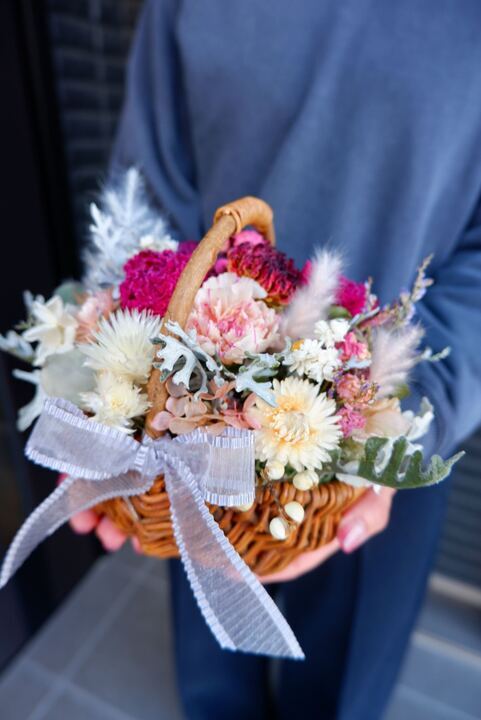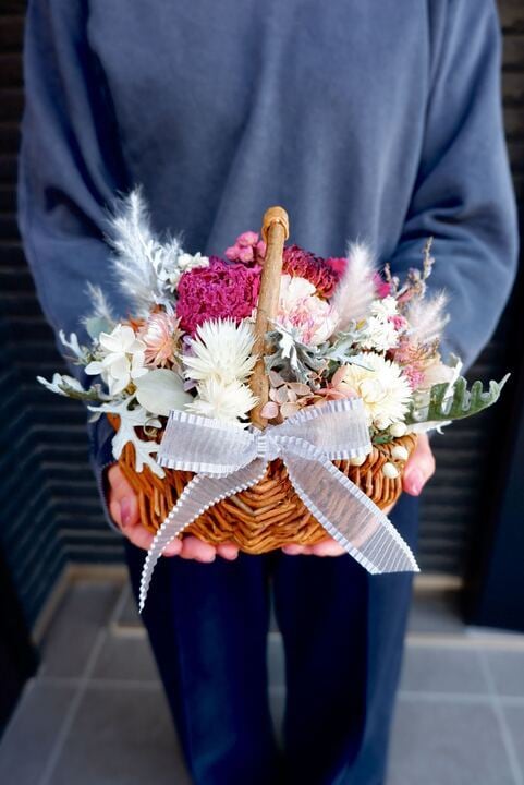 ピンク、ホワイト系の大人可愛いの華やかなバスケットアレンジです。