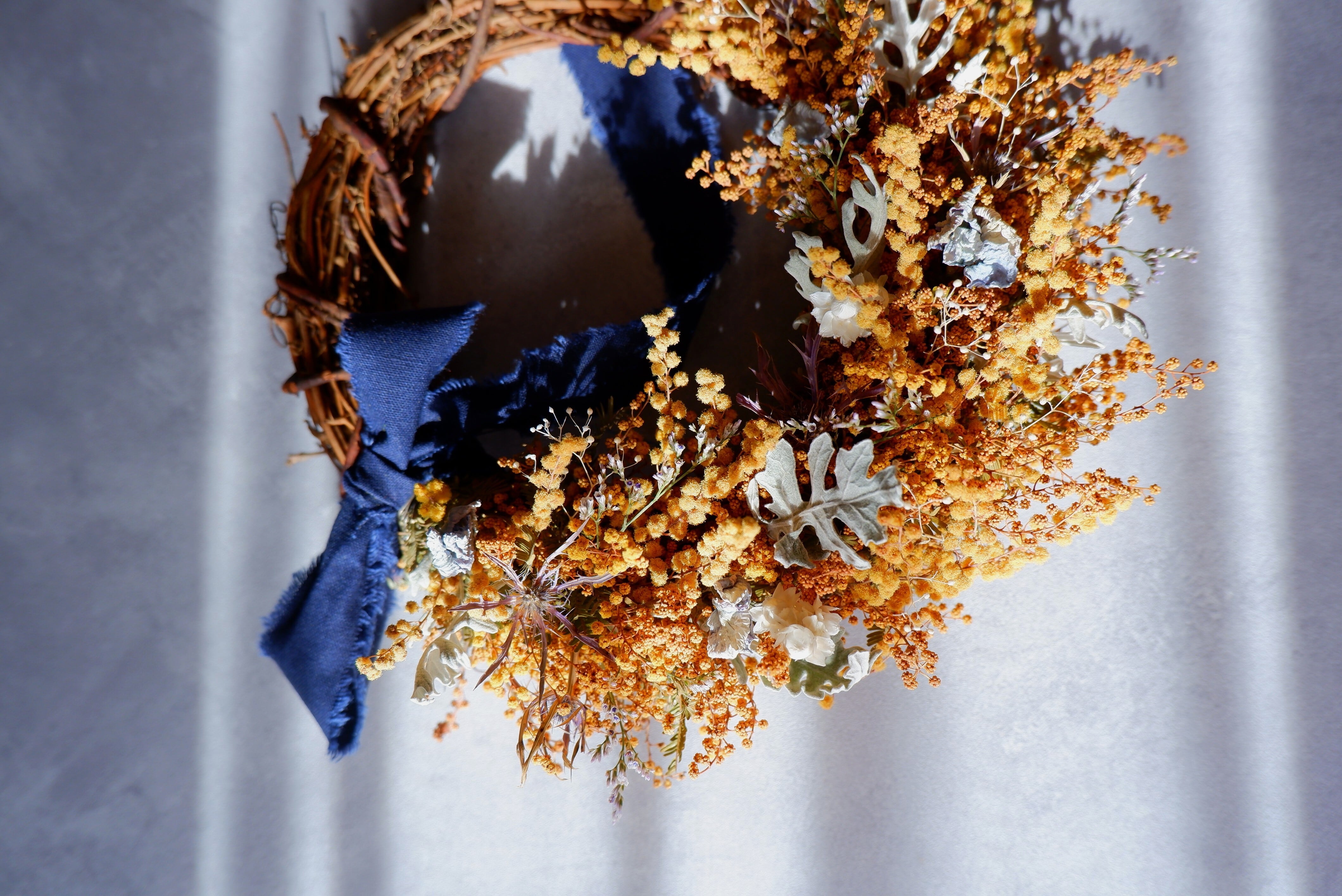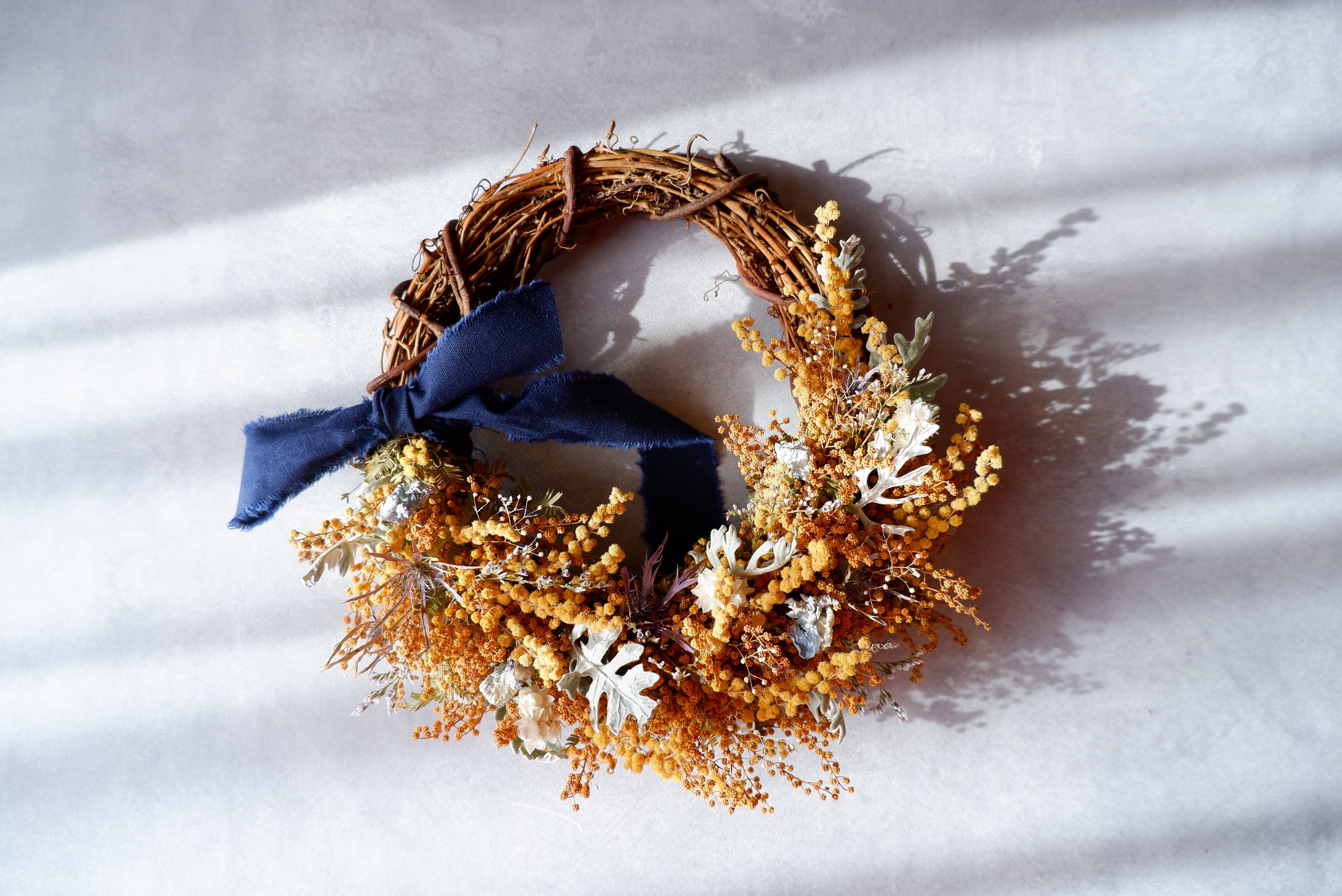 飾るだけで空間が明るくなる、季節を楽しむ一点もののミモザリースです。
