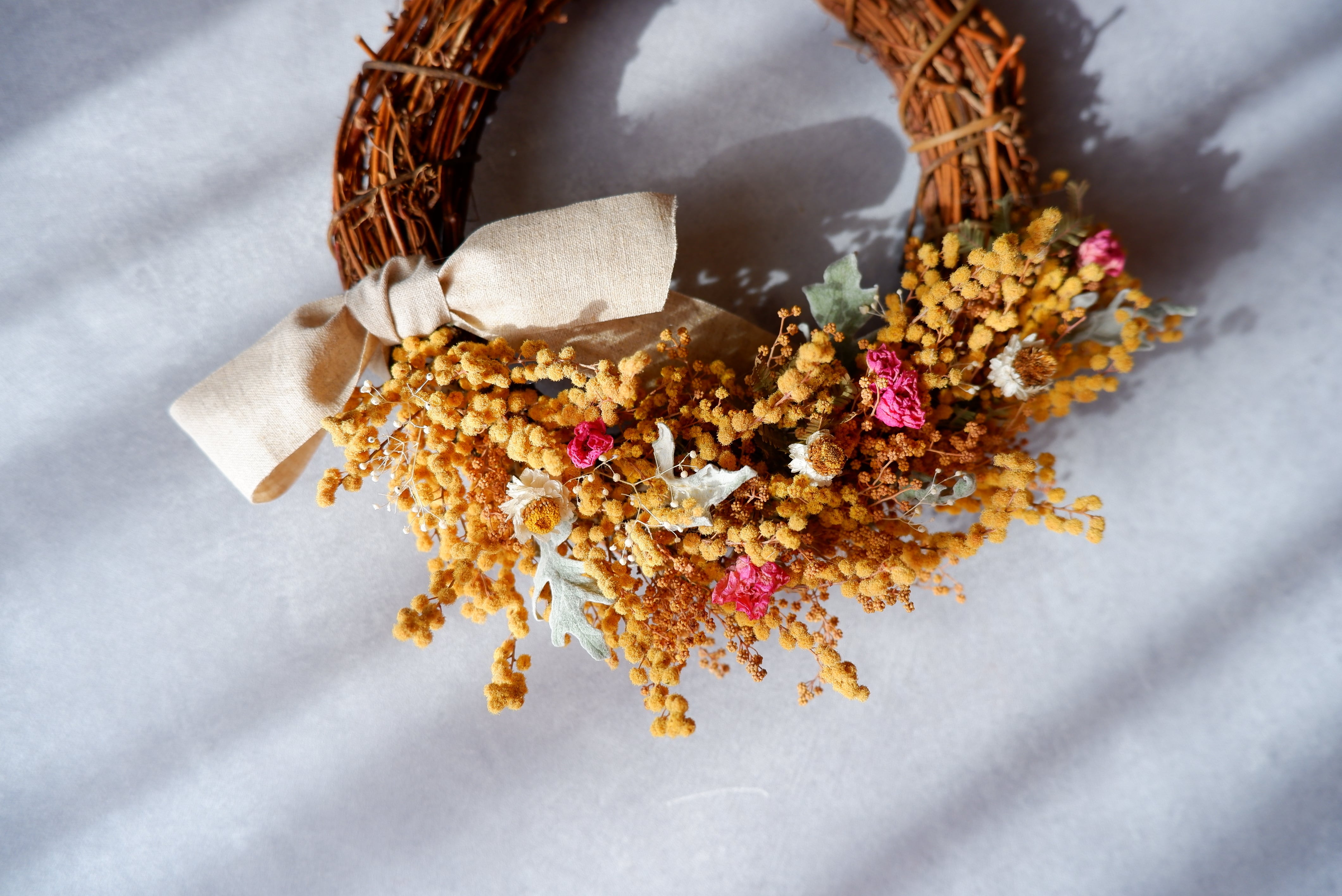 ドライフラワーはとてもデリケートですので、取り扱いには十分にご注意ください。また、生花を乾燥させて制作しているため、色が褪せてきたり、花や葉が崩れたり落ちたりする場合があります。