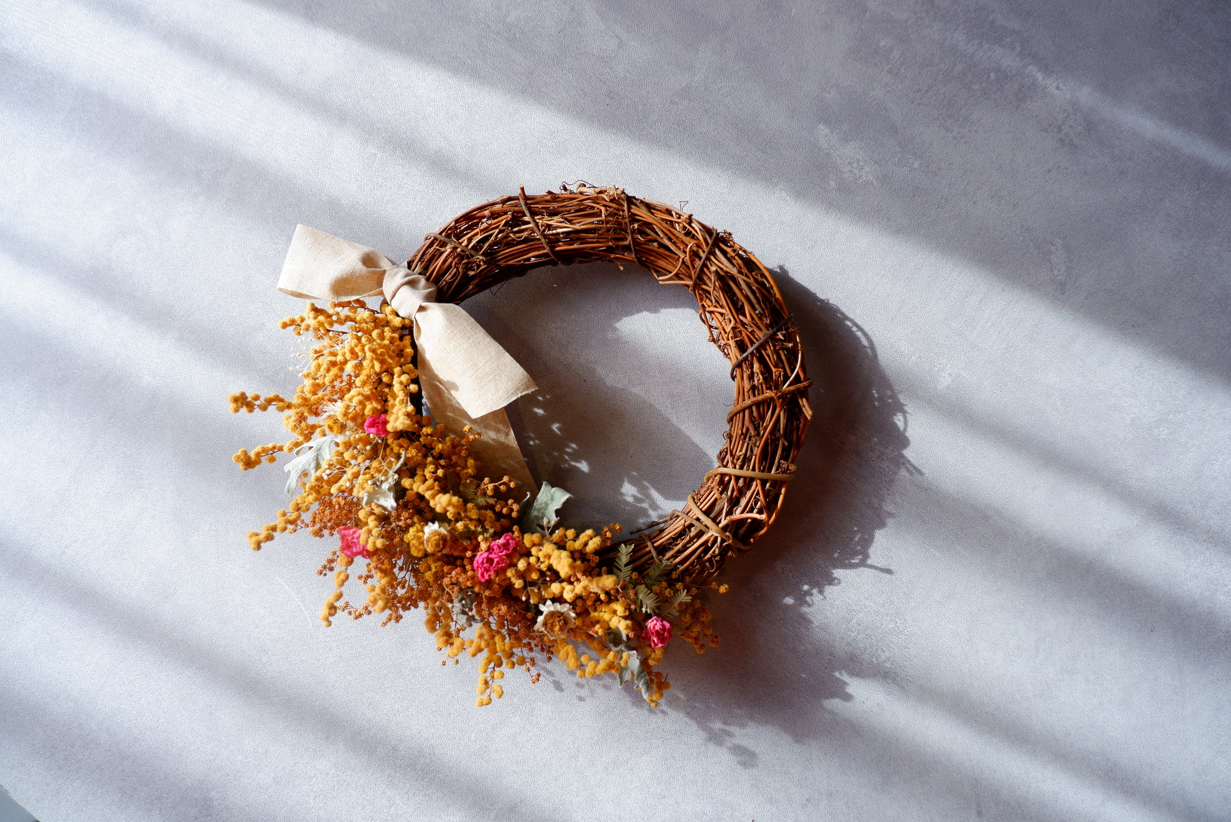 たっぷりのミモザを主役に、春の光をまとったようなリースに仕上げました。
